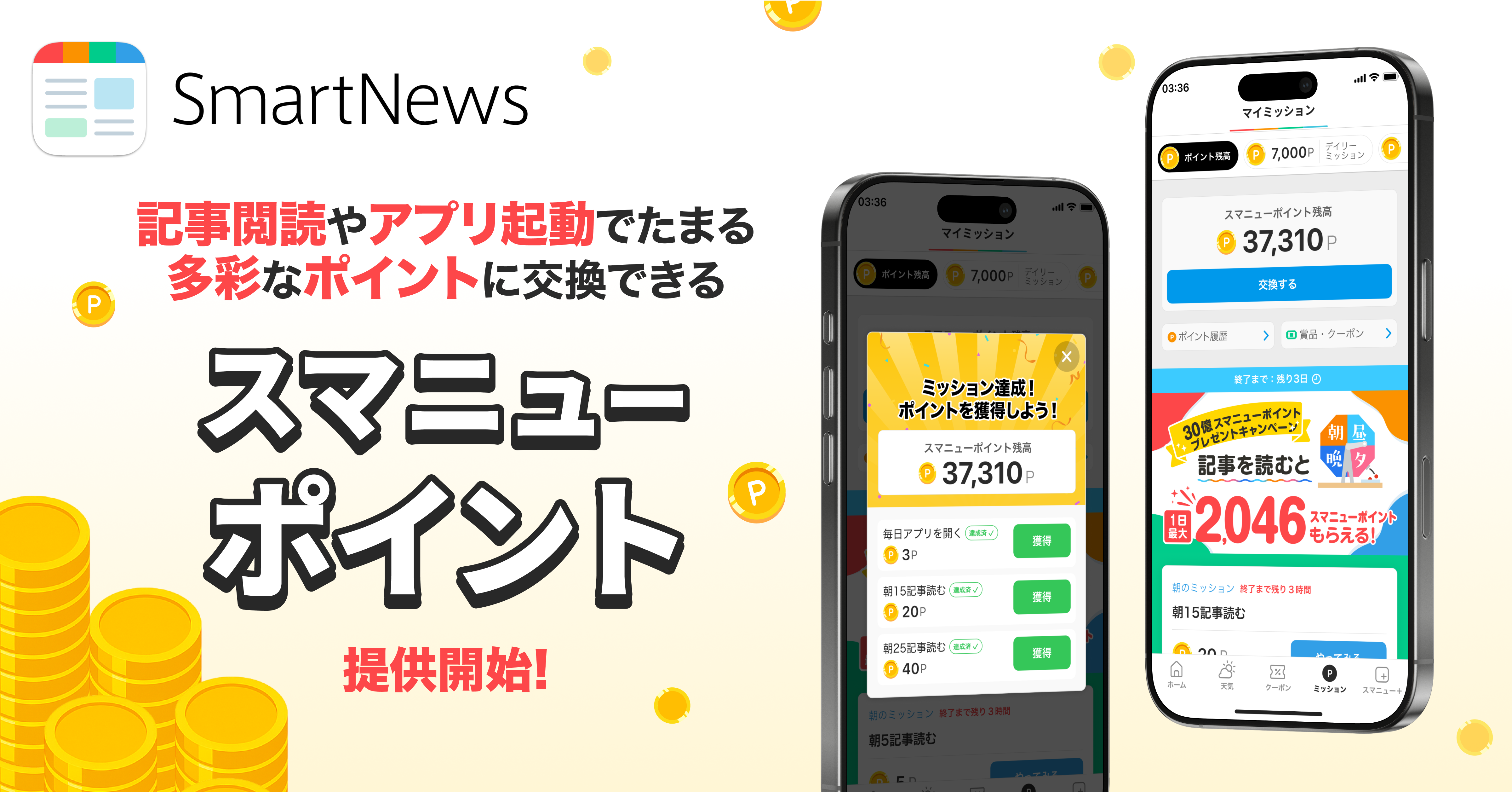 世界中の良質な情報を必要な人に送り届けることをミッションとするスマートニュース株式会社(東京都渋谷区、代表取締役 CEO:浜本階生)は9月29日、ニュースアプリ「SmartNews」で新ポイントプログラム「スマニューポイント」を開始しました。記事閲読やアプリ起動でポイントをためやすくなり、ためたポイントは10以上のサービスで交換可能です。さらに、買い物のレシート投稿やオンラインサービスの利用でもポイントが獲得でき、ニュース閲覧と多様なポイ活を同時にできる“お得なニュースアプリ”へと進化します。